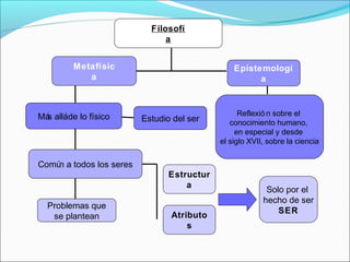 El documento resume las principales ideas filosóficas de Aristóteles. Aristóteles estudió en la Academia Platónica pero desarrolló sus propias ideas, diferenciándose de Platón en temas como la inmanencia del alma y la mortalidad de esta. Aristóteles también propuso doctrinas como las cuatro causas, la analogía del ser, la distinción entre sustancia y accidente, y los conceptos de materia, forma, potencia y acto.