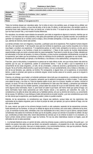 Aristóteles argumenta que todos los seres humanos desean saber por naturaleza. Explica que la experiencia surge del recuerdo y que el arte surge de muchas observaciones experimentales. Aunque la experiencia es útil para la vida práctica, Aristóteles considera que el arte es más sabio porque conoce las causas universales, mientras que la experiencia solo conoce casos particulares. Finalmente, concluye que la sabiduría trata sobre los principios y causas fundamentales.