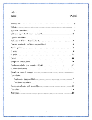Este documento proporciona una introducción a los conceptos básicos de la contabilidad. Explica brevemente la historia de la contabilidad, define qué es la contabilidad y sus objetivos, y describe los principales libros y estados financieros contables como el diario, mayor, balance general y estado de resultados. También resume los pasos básicos para registrar las transacciones contables usando el sistema de partida doble y cómo se transfieren los asientos entre los libros para preparar los estados financieros.
