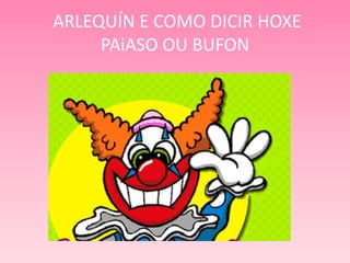 Este documento habla sobre el personaje de Arlequín en la Edad Media. Explica que originalmente se llamaba un demonio y representaba al tonto, tramposo e inútil. Su trabajo era entretener al rey en el teatro tocando instrumentos y contando chistes. También tenía que dar buenos espectáculos en los banquetes. La Edad Media tenía muchos juegos populares como esgrima, peonzas, bolos y otros como pelota, escondite y pillapilla.