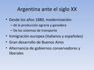 El documento analiza la evolución de Argentina en el siglo XX, desde la modernización agraria y el desarrollo de Buenos Aires, hasta el impacto del peronismo y las dictaduras. Se enfoca en la literatura argentina, destacando a autores como Roberto Arlt y Julio Cortázar, así como sus aportes y posturas políticas, especialmente en relación con el contexto social y los movimientos de izquierda. Además, se menciona la importancia de la literatura como respuesta a las realidades históricas y políticas de la época.