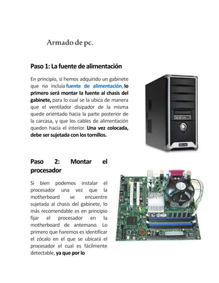 Este documento proporciona un resumen paso a paso del proceso de armado de una computadora personal (PC). Los 8 pasos incluyen: 1) montar la fuente de alimentación, 2) instalar el procesador, 3) colocar la placa madre en la caja, 4) agregar la memoria RAM, 5) conectar los cables, 6) agregar placas adicionales, 7) conectar los dispositivos de almacenamiento y 8) ordenar los cables antes de cerrar la caja. El documento ofrece instrucciones detalladas para cada paso del pro