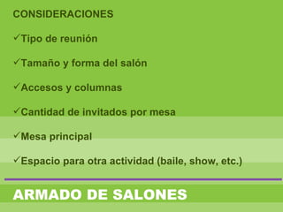 Este documento describe diferentes consideraciones y tipos de servicios y comidas para eventos gastronómicos. Explica cómo armar salones teniendo en cuenta el tipo de reunión, tamaño del salón y cantidad de invitados. Luego detalla diferentes tipos de servicios como servicio americano, inglés, francés y buffet. Finalmente, describe varios tipos de comidas como cóctel, asado formal, comida formal, vino de honor, desayunos de trabajo y ceremonia del té.