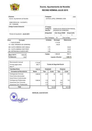 Este documento es un recibo de nómina de julio de 2015 para Armando José Esteve López de Novelda, Alicante. Se detallan los conceptos devengados como sueldo base de 1.714,28€, asistencia a órganos de gobierno de 150€ y las retenciones de la nómina incluyendo la retención del IRPF del 3,6%. El liquido a percibir fue de 1.669,17€.