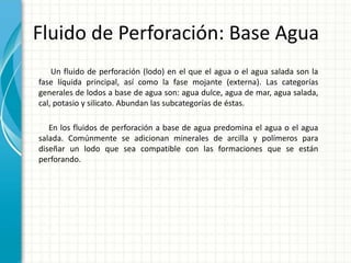 Este documento trata sobre los fluidos de perforación a base de agua. Explica que estos fluidos usan agua o agua salada como la fase líquida principal y que comúnmente se agregan arcillas y polímeros. Detalla las ventajas e inconvenientes de estos fluidos y describe sus características generales como consistir en una mezcla de sólidos, líquidos y químicos con agua como fase continua. También explica el uso de agua salada y salobre en operaciones costa afuera y costaneras debido a su disponibil