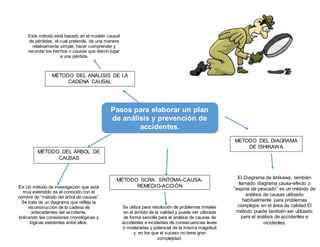 El documento describe varios métodos para analizar accidentes e incidentes, incluyendo el diagrama de Ishikawa, el método del árbol de causas, y el método SCRA. Explica que el diagrama de Ishikawa y el método del árbol de causas son usados comúnmente para identificar las causas raíz de problemas complejos o accidentes mediante la reconstrucción de la cadena de eventos. También presenta los pasos para elaborar un plan de análisis y prevención de accidentes usando estos métodos.