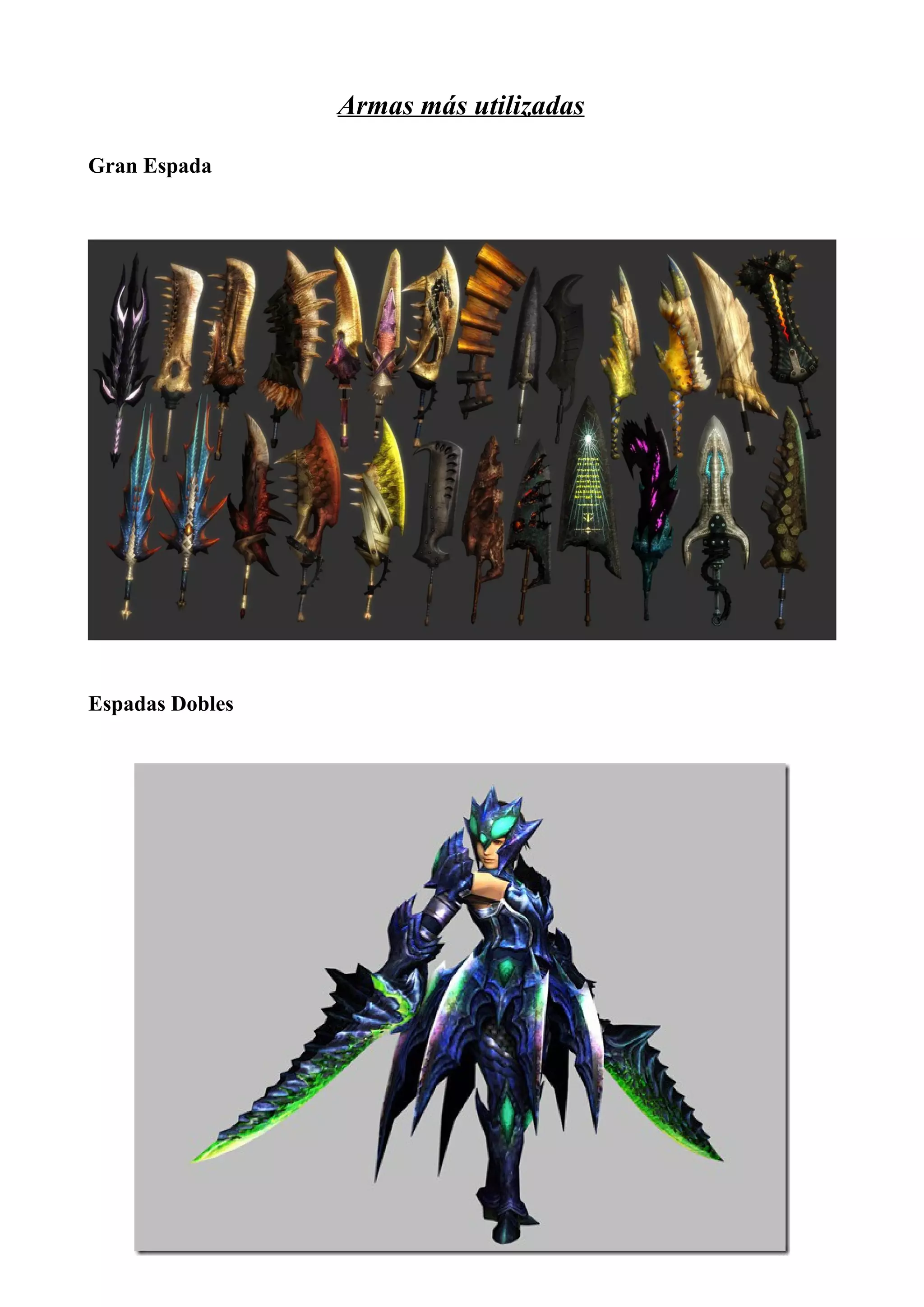 Las armas más utilizadas incluyen la gran espada, espadas dobles, hacha espada, espada larga y el arco, que son las principales armas blancas y de proyectiles mencionadas en el documento.