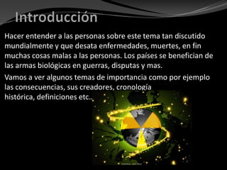Este documento discute las armas biológicas, incluyendo sus definiciones, tipos (bacterias, virus, toxinas y rickettsias), métodos de dispersión (aerosoles, animales, contaminación de alimentos y agua), y algunos ejemplos históricos de su uso en guerras y conflictos.