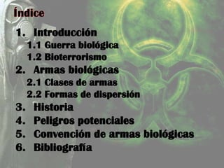 El documento describe la historia y naturaleza de las armas biológicas. Explica que las personas han usado armas biológicas desde la antigüedad y que hoy en día representan una gran amenaza debido a la capacidad de producción y concentración de poblaciones. Las armas biológicas incluyen bacterias, virus, toxinas y otros patógenos que se usan para dañar la salud de militares y civiles.