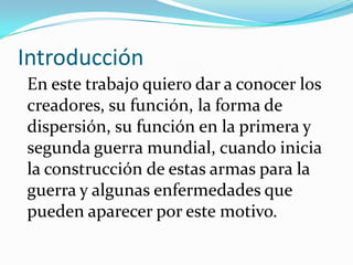 Este documento resume las armas biológicas, incluyendo su definición como patógenos usados como armas de guerra, sus creadores, formas de dispersión como aerosoles o contaminación de alimentos, y su uso en las guerras mundiales. También discute enfermedades causadas por armas biológicas como el carbunco y ébola.