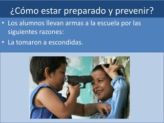 El documento ofrece consejos sobre cómo prevenir y responder a situaciones en las que estudiantes o adultos llevan armas a la escuela. Recomienda no confrontar directamente a la persona, informar a las autoridades y buscar ayuda profesional. También sugiere usar el incidente como oportunidad para enseñar a los estudiantes sobre los peligros de las armas y que no son juguetes.