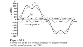 El documento describe la distorsión armónica en voltajes y corrientes industriales, causada por saturación magnética, conmutación o cargas no lineales. Explica que los armónicos son voltajes o corrientes con frecuencias múltiplos enteros de la frecuencia fundamental, y cómo se pueden representar ondas distorsionadas mediante diagramas fasoriales. También cubre formas de medir y reducir la distorsión armónica, incluidos filtros pasivos y activos.
