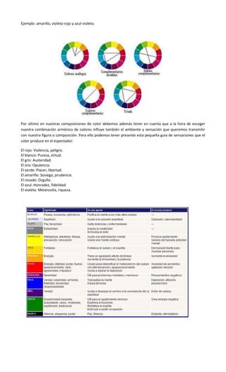 La armonía del color implica lograr un equilibrio entre los colores de una composición para producir una sensación estética de calma en el espectador. Este equilibrio se logra a través de tres colores: el dominante, el tónico y el de mediación. Existen diferentes esquemas de armonía como el análogo, el de complementarios y la tríada equidistante, los cuales se basan en la ubicación de los colores en el círculo cromático. La elección de los colores también debe considerar la sensación que se quiere transmit