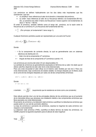 Este documento trata sobre los armónicos en sistemas de distribución de energía. Explica que los armónicos son componentes sinusoidales de frecuencias múltiplos de la frecuencia fundamental que surgen de las cargas no lineales. Estas cargas inyectan corrientes no sinusoidales que contienen armónicos y pueden causar distorsiones. También describe cómo se calculan los índices de distorsión armónica y el contenido normal de armónicos, así como los efectos de los armónicos como el aumento de la corriente eficaz