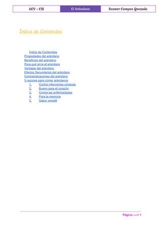 El documento describe las propiedades y beneficios del arándano. Detalla que el arándano tiene propiedades antioxidantes que ayudan a prevenir enfermedades como el cáncer y las cardiovasculares. También tiene un poder antiadherente que evita que bacterias dañinas se adhieran a las paredes gastrointestinales. Entre los beneficios se incluyen prevenir infecciones urinarias, ser bueno para el corazón, combatir enfermedades y mejorar la memoria. No tiene efectos secundarios graves cuando se consume en dosis normales.