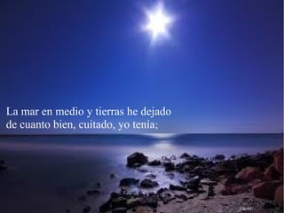 Este soneto describe la tristeza y el desamparo del poeta al verse alejado de su tierra y de todo lo que tenía, dejando atrás el mar y la tierra. Ahora se encuentra en un lugar extraño rodeado de gente, costumbres y lenguas desconocidas, sin poder remediar ningún mal sino esperando la muerte que ponga fin a su sufrimiento.