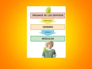 El documento describe la función de relación del cuerpo humano, que consiste en captar información del exterior a través de los sentidos, interpretarla en el cerebro y actuar en consecuencia mediante el sistema muscular y óseo. Explica que los sentidos captan los estímulos y los transmiten al cerebro a través de nervios, y que el cerebro coordina los movimientos voluntarios, reflejos e involuntarios con la ayuda del sistema nervioso y muscular. También describe cómo los