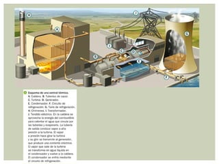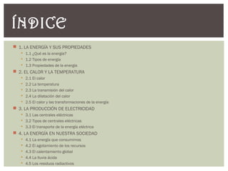 Este documento resume los principales conceptos relacionados con la energía. Explica que la energía puede ser mecánica, sonora, luminosa, calorífica, eléctrica, química o nuclear. También describe cómo se produce la electricidad en centrales eléctricas y los problemas asociados con el consumo de energía como el agotamiento de recursos, el calentamiento global, la lluvia ácida y los residuos radiactivos.