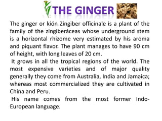 Este documento resume las propiedades y usos del jengibre. Describe que el jengibre es una planta tropical cuyo rizoma se utiliza ampliamente en la cocina y medicina. Se usa comúnmente en platos asiáticos y postres occidentales, y tiene propiedades analgésicas, antiinflamatorias y para mejorar la circulación. El documento también cubre el cultivo, taxonomía y remedios caseros con jengibre.