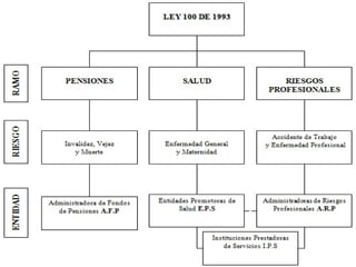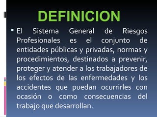El documento define el Sistema General de Riesgos Profesionales en Colombia, el cual incluye entidades públicas y privadas, normas y procedimientos para prevenir y atender enfermedades y accidentes laborales. Establece que los accidentes y enfermedades profesionales afectan la productividad empresarial. También describe las prestaciones médicas y económicas a las que tienen derecho los trabajadores en caso de accidente o enfermedad profesional.