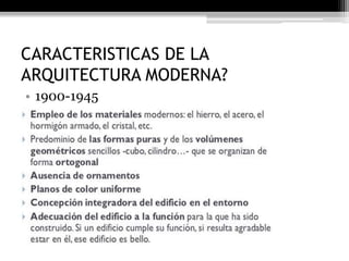 La arquitectura moderna se desarrolló entre 1900 y 1945. Uno de sus principales exponentes fue Le Corbusier, quien en 1926 expuso cinco puntos clave de esta arquitectura: pilotes, terrazas jardín, planta libre, fachada libre y ventanas alargadas. La Villa Savoye, construida en Poissy, Francia, siguió estos principios funcionales y racionalistas utilizando materiales como el acero, el vidrio y el cemento armado. La villa buscaba proporcionar un espacio digno para el des