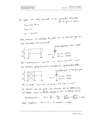 Este documento presenta la resolución de un ejercicio estructural que involucra el cálculo de los perfiles requeridos para una columna y viga. Se define la geometría de la estructura, las cargas y esfuerzos sobre la columna y viga, y los materiales disponibles. Luego, se realizan los cálculos para determinar los momentos admisibles de la columna y seleccionar un perfil que satisfaga las condiciones de solicitación. Finalmente, se elige un perfil de viga tal que su momento admisible sea mayor que el momento