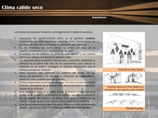 El documento describe las características arquitectónicas típicas de diferentes climas. Para los climas cálidos seco y húmedo, enfatiza la importancia de la ventilación, sombra y protección de la radiación solar. En el clima templado, destaca el uso de patios, voladizos y materiales aislantes. Finalmente, para el clima frío, resalta la necesidad de conservar el calor interior mediante la acumulación de nieve, desvanes y aprovechamiento del calor humano y animal.