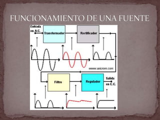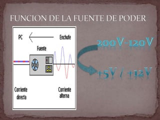 El documento describe las diferentes fuentes de poder para computadores, incluyendo las fuentes AT y ATX. Explica que las fuentes ATX tienen conectores de 20 o 24 terminales que suministran voltaje a la placa madre, mientras que las fuentes AT usan conectores Molex y Berg para lo mismo. También menciona conectores SATA y para procesadores.
