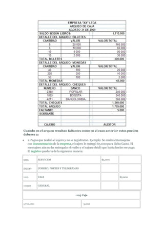 El documento habla sobre el arqueo de caja, que consiste en contar el efectivo en caja y compararlo con el saldo registrado para verificar que todo el dinero recibido haya sido contabilizado correctamente. También explica los posibles resultados del arqueo como faltantes o sobrantes y sus causas, así como la importancia de realizar arqueos periódicamente para verificar los controles internos.