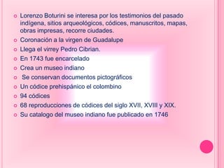 El documento resume información sobre varios códices y lienzos mesoamericanos prehispánicos y coloniales que fueron recolectados y preservados. Describe brevemente cada artefacto, incluyendo su origen, contenido cultural e histórico, y su ubicación actual en museos u otras colecciones. También menciona libros escritos en lenguas indígenas con el fin de preservar las culturas y conocimientos tradicionales.