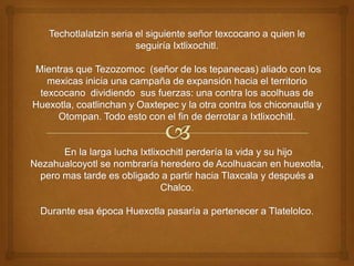 Huexotla era un importante asentamiento prehispánico en el valle de México conocido como el "lugar de los sauces". Actualmente se conservan ruinas como murallas almenadas, el basamento de un templo circular dedicado a Ehécatl y un ex-convento del siglo XVI. A pesar del paso del tiempo y su ubicación, el INAH se ha encargado de preservar el sitio arqueológico y desarrollar proyectos para su estudio y difusión.