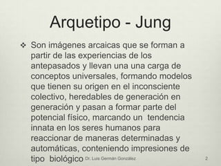 El documento explora los arquetipos según Carl Jung, describiendo cómo estas imágenes arcaicas influyen en la personalidad humana a partir del inconsciente colectivo y personal. Se detallan arquetipos clave como la persona, la sombra, el anima, el animus, la gran madre, el anciano sabio, el héroe y el yo. Estos arquetipos representan diferentes aspectos de la psicología individual y colectiva, moldeando nuestra forma de interactuar con el mundo.