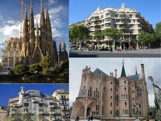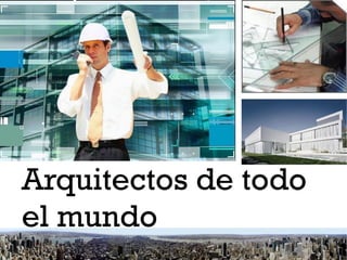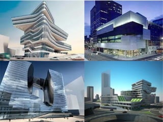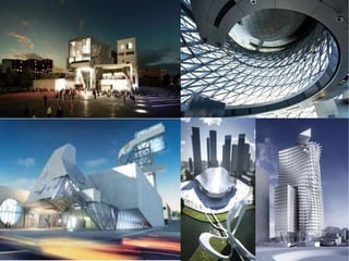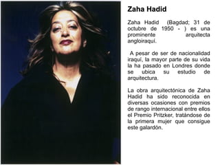 El documento presenta información sobre varios arquitectos destacados como Zaha Hadid, la primera mujer en ganar el Premio Pritzker, Enrique Norten con sus proyectos en México, el estudio Coop Himmelblau fundado en Viena y sus premios, Norman Foster ganador del Premio Príncipe de Asturias de las Artes, Frank Lloyd Wright conocido por proyectos como Fallingwater y Antoni Gaudí, máximo representante del modernismo catalán y sus primeros proyectos de carrera.