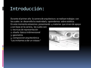 El documento describe las cuatro materias principales del primer año de la carrera de arquitectura: técnicas de representación, diseño básico tridimensional, geometría y composición arquitectónica. Estas materias se enfocan en desarrollar la creatividad, aprender sobre estética y proporcionar una base sólida en habilidades fundamentales como el dibujo y la representación de espacios tridimensionales.
