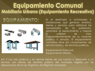 El documento habla sobre los diferentes tipos de equipamiento comunal requeridos en las subdivisiones de suelo y desarrollos urbanos, incluyendo espacios verdes, recreativos y de servicios sociales. Define categorías de equipamiento como barrial, sectorial y zonal, y establece normas mínimas de áreas por habitante. También menciona algunos mercados artesanales y parques importantes de la ciudad de Loja.