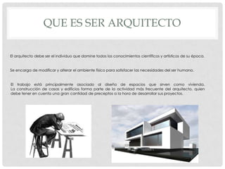 La arquitectura es el arte y la técnica de diseñar y proyectar edificios y estructuras que forman el entorno humano. El arquitecto debe dominar los conocimientos científicos y artísticos de su época para modificar el ambiente físico y satisfacer las necesidades humanas, principalmente a través del diseño de viviendas y edificios. La arquitectura tradicionalmente ha sido considerada una de las Bellas Artes ya que los edificios pueden ser obras de arte por su forma estética, y los arquitectos