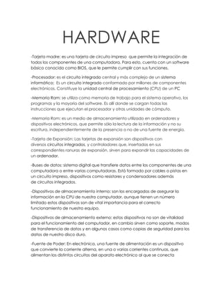 El documento describe los principales componentes de hardware de una computadora, incluyendo la tarjeta madre, el procesador, la memoria RAM y ROM, las tarjetas de expansión, los buses de datos, los dispositivos de almacenamiento internos y externos, y la fuente de poder. Estos componentes trabajan juntos para permitir que la computadora procese y almacene datos e información.