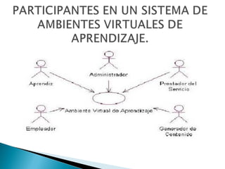 Este documento describe los componentes clave de un ambiente virtual de aprendizaje, incluyendo usuarios (aprendices, empleadores, especialistas), tres fases del desarrollo (planeación, diseño y desarrollo, operación) y los roles involucrados en cada fase.