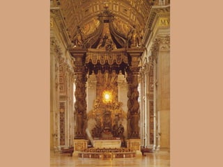 La arquitectura barroca se caracteriza por el dinamismo y el movimiento de sus formas. Las iglesias y palacios barrocos buscaban impresionar y propagar el poder de la Iglesia y la monarquía a través de efectos teatrales y volúmenes ondulantes. Arquitectos como Bernini y Borromini rompieron las reglas clásicas para dotar a sus edificios de curvas cóncavas y convexas que producían dramáticos juegos de luces y sombras.