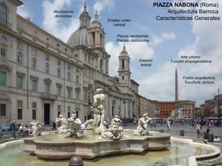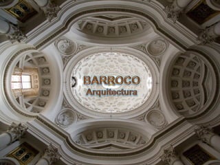 El documento describe la arquitectura barroca en Italia y Francia a través de obras representativas de Bernini, Borromini y el Palacio de Versalles. Resalta el empleo de efectos escenográficos, claroscuros y curvas para crear dinamismo. También destaca la integración de arquitectura, escultura y pintura, así como el uso propagandístico del arte.