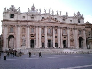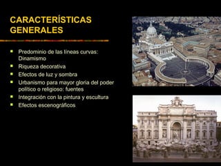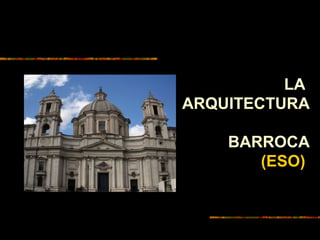 El documento describe la arquitectura barroca en España, con un enfoque en sus características y evolución. Comienza con una introducción general al Barroco español, luego describe tres etapas clave: 1) la primera etapa de raíces herrerianas, 2) la segunda etapa decorativa de los hermanos Churriguera, y 3) la tercera etapa de continuidad y cambio hacia el estilo Rococó y la arquitectura palaciega borbónica. Resalta arquitectos clave como los Churriguera