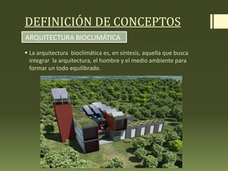 La arquitectura bioclimática busca integrar la arquitectura, el ser humano y el medio ambiente para crear un equilibrio. Define conceptos clave como ecosistema, bioma, clima, asoleamiento, población y contaminación y explica cómo factores como la ubicación, forma, orientación, ventilación y aprovechamiento del suelo influyen en el comportamiento climático de un edificio de manera sostenible. También destaca la importancia de considerar factores bioclimáticos para crear espacios habitables con condiciones de conf