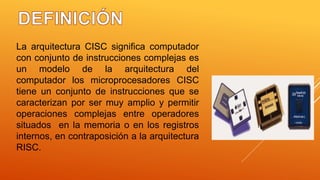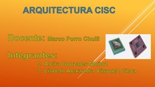 La arquitectura CISC se refiere a computadoras con conjuntos de instrucciones complejas. Los microprocesadores CISC tienen amplios conjuntos de instrucciones que permiten operaciones complejas entre registros y memoria, a diferencia de RISC. Las instrucciones complejas en CISC se descomponen internamente en microinstrucciones, lo que dificulta el paralelismo. Ejemplos importantes de arquitecturas CISC son Intel 8086 e Intel 80486.
