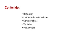 La arquitectura CISC permite instrucciones complejas que operan sobre operandos en memoria o registros, a diferencia de RISC. Las instrucciones CISC se descomponen internamente en microinstrucciones ejecutadas en varios ciclos, haciendo que CISC sea más lento que RISC. CISC tiene ventajas como facilidad de programación y compatibilidad, pero desventajas como complejidad creciente del conjunto de instrucciones y reducción del rendimiento por instrucciones de longitud variable.