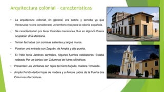 La arquitectura colonial en Venezuela se caracterizaba por ser sobria y sencilla. Generalmente consistía en grandes mansiones con fachadas de largos muros que contenían una entrada principal de amplia puerta de madera y zaguán, así como patios interiores con jardines y columnas. Los materiales utilizados eran la piedra, arcilla, bahareque, madera y caña, y tenían un enfoque práctico sobre lo artístico.