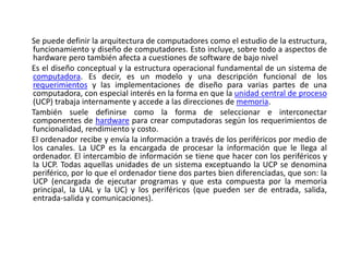 El documento resume los conceptos fundamentales de la arquitectura de computadores, incluyendo su definición, componentes clave como la unidad central de procesamiento y la memoria, y clasificaciones de arquitecturas e instrucciones. También describe brevemente los procesadores, memorias, dispositivos de entrada y salida, y redes de computadoras.