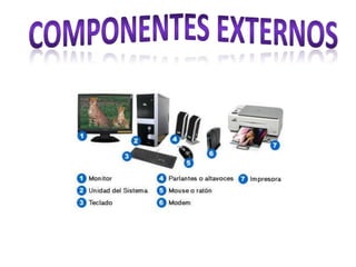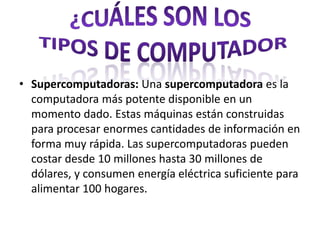 El documento describe los diferentes tipos de computadoras, desde supercomputadoras hasta computadoras personales, y explica los componentes principales de una computadora como la placa base, la CPU, la memoria RAM, las tarjetas de video y de red, los discos duros, y periféricos como teclado, mouse e impresora. También define conceptos como buses, puertos y otros elementos internos importantes para el funcionamiento de una computadora.