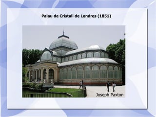 El documento menciona varios ejemplos importantes de arquitectura e ingeniería como el Palacio de Cristal de Londres, la Torre Eiffel, el Edificio Reliance de Chicago y el puente Coalbrookdale sobre el Severn y provee los nombres de sus arquitectos e ingenieros como Joseph Paxton, Alexandre Gustave Eiffel, Burnham y Root y Pritchard y J. Wilkinson. También menciona la Estación de Atocha de Madrid diseñada por Ricardo Velázquez Bosco, la Escuela de Chicago bajo la dirección de Frank H. Kn