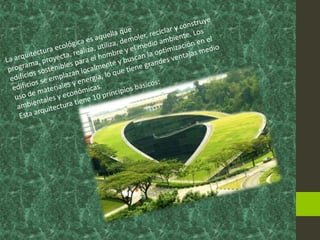 La arquitectura ecológica implica valorar las necesidades reales de espacio, proyectar la obra de acuerdo al clima local para aprovechar la energía natural, ahorrar energía a través de buen aislamiento térmico y sistemas de bajo consumo, e incorporar fuentes de energía renovables. También es importante ahorrar agua, utilizar materiales locales de bajo impacto, y evitar riesgos a la salud.