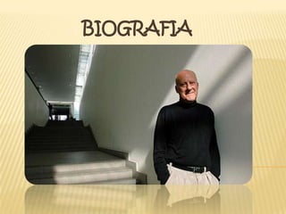 El documento presenta información biográfica y sobre la filosofía y obras del arquitecto británico Norman Foster. Nació en 1935 y estudió arquitectura en la Universidad de Mánchester. Es fundador de Foster + Partners y ha diseñado numerosos edificios notables como la Torre Commerzbank, el Viaducto de Millau y la Torre Swiss Re utilizando un estilo moderno y técnico. Foster cree que los espacios donde vivimos influyen en nuestra calidad de vida y se enfoca en el contexto, cultura y sosten